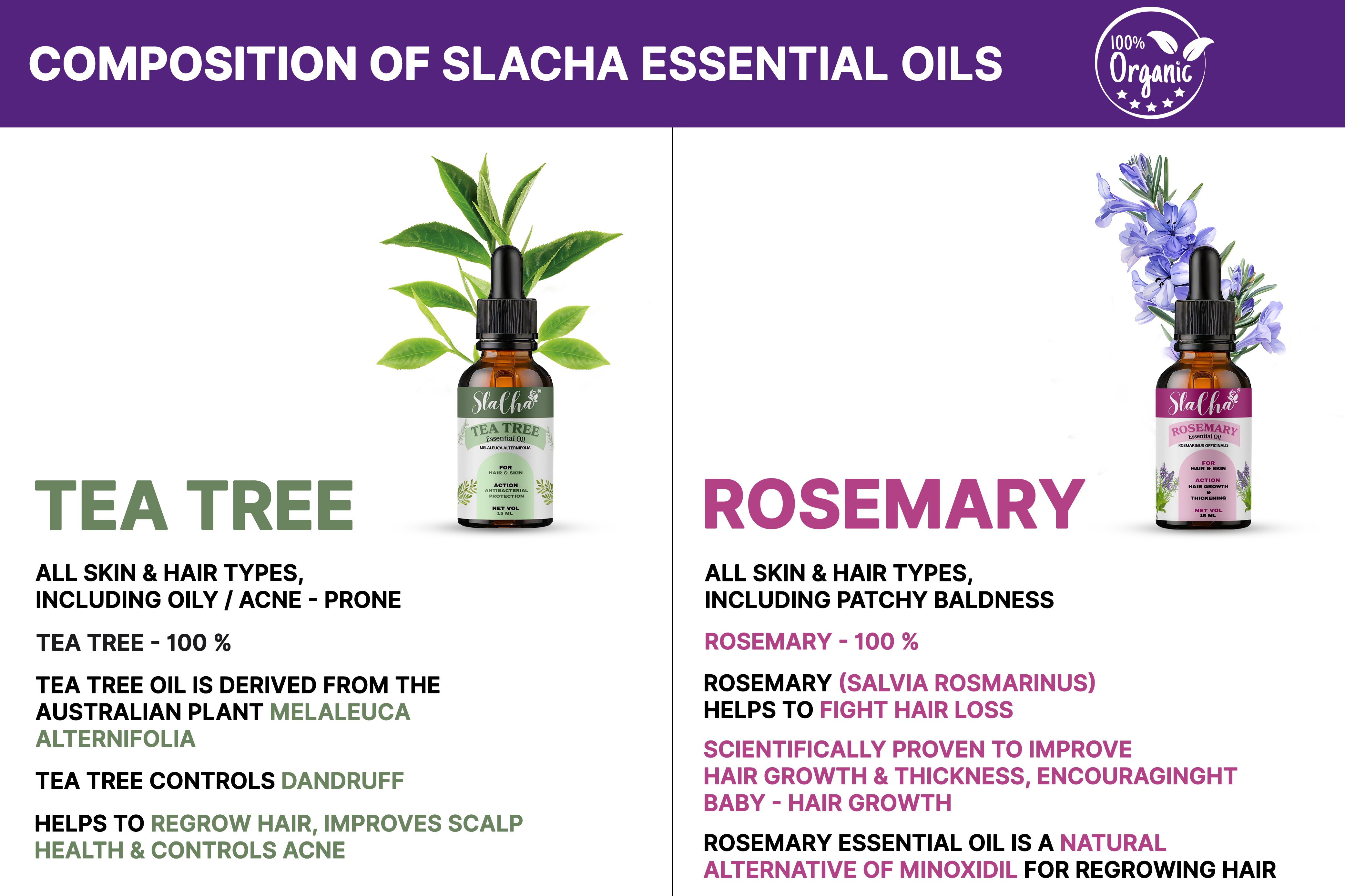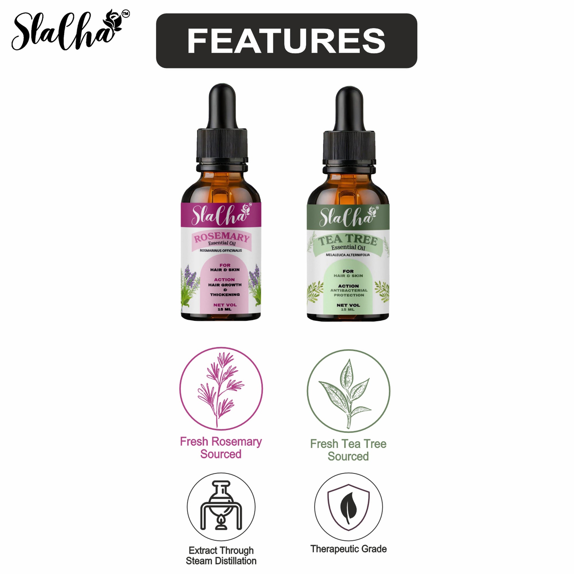Slacha Tea Tree & Rosemary Essential Oil | 100% Pure & Natural | Steam Distilled | For Hair Growth, Skin Care & Relaxation | 15ML (Pack of 2) (BUY 1 PACK GET 1 FREE)